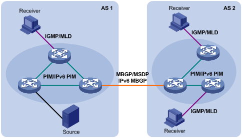 通常,我们把工作在网络层的IP组播称为“三层组播”,相应的组播协议称为“三层组播协议”,包括IGMP/MLD、PIM/IPv6 PIM、MSDP、MBGP/IPv6 MBGP等;把工作在数据链路层的IP组播称为“二层组播”,相应的组播协议称为“二层组播协议”,包括IGMP Snooping/MLD Snooping、PIM Snooping/IPv6 PIM Snooping、组播VLAN/IPv6组播VLAN等。其中,IGMP Snooping、PIM Snooping、组播VLAN、IGMP、PIM、MSDP和MBGP应用于IPv4;MLD Snooping、IPv6 PIM Snooping、IPv6组播VLAN、MLD、IPv6 PIM和IPv6 MBGP应用于IPv6。本节主要针对二、三层组播协议在网络中的应用位置和功能进行总体介绍,有关各协议的详细介绍请参见“IP组播配置指导”中的相关章节。