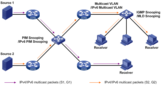 二层组播协议包括IGMP Snooping/MLD Snooping、PIM Snooping/IPv6 PIM Snooping、组播VLAN/IPv6组播VLAN等,它们在网络中的应用位置如图1-9所示。