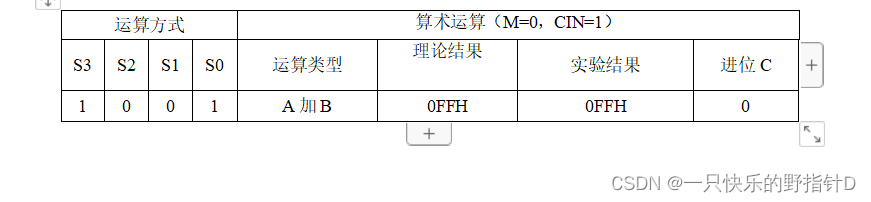 说明:M=0为算术运算,M=1为逻辑运算;S3~S0为运算功能;CIN为1,正逻辑;ABUS=1允许运算结果送数据总线;LDC、LDZ为1,允许保存结果状态;RD1、RD0用00选择R0;RS1、RS0用01选择R1;(DRW、SBUS、MBUS命令为0)。