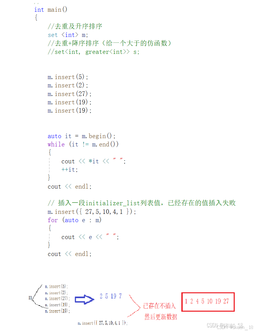 在set,元素的值也可以标识它自己(值本身就是类型为 T 的键),值必须是唯一的,值不能修改在容器中,但可以从容器中插入或删除元素。