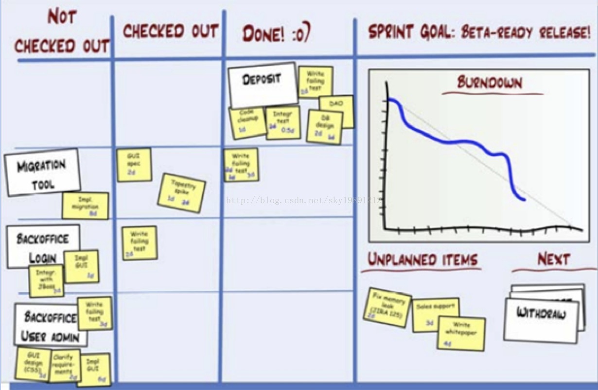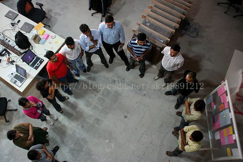在Sprint的进行中,团队每天都要举行简短的Scrum会议,以便成员了解开发进度,一个Sprint之后,召开Sprint评审会议和回顾会议,在会议上,团队展示这个Sprint开发成果。Scrum会议地点选在任务版前,时间控制在15min,站立面对面沟通,会议记录轮流进行。精髓是避免大家各自为战的状态。每人都介绍昨天做了什么,今天做什么,遇到哪些问题和挑战?然后leader开始移动任务卡片。对于不能解决的任务可以交给其他能够解决问题的人去做。