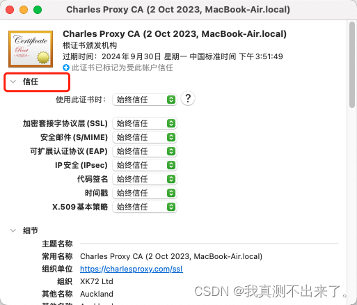 第二件事是打开“钥匙串访问”,直接搜索“charles”,双击打开,点击信任,把第一个使用此证书时,改为始终信任