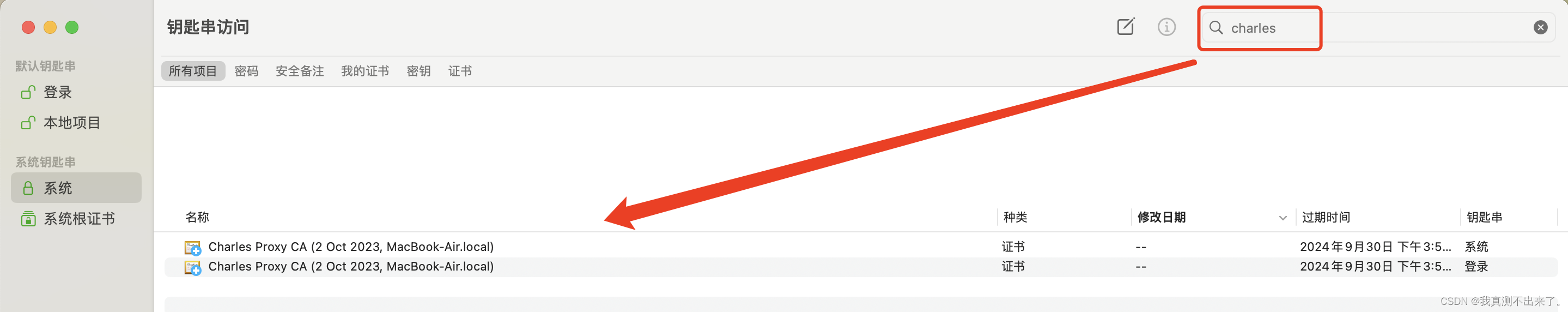 1、搜索“钥匙串访问”,直接搜索“charles”,找到打叉的名称,直接删掉