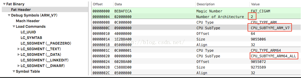 该dSYM文件包含armv7和arm64两种架构的符号表,我们只看armv7(arm64同理),它偏移64,直接定位到64(0x00000040),这里就是上面的Mach Header信息