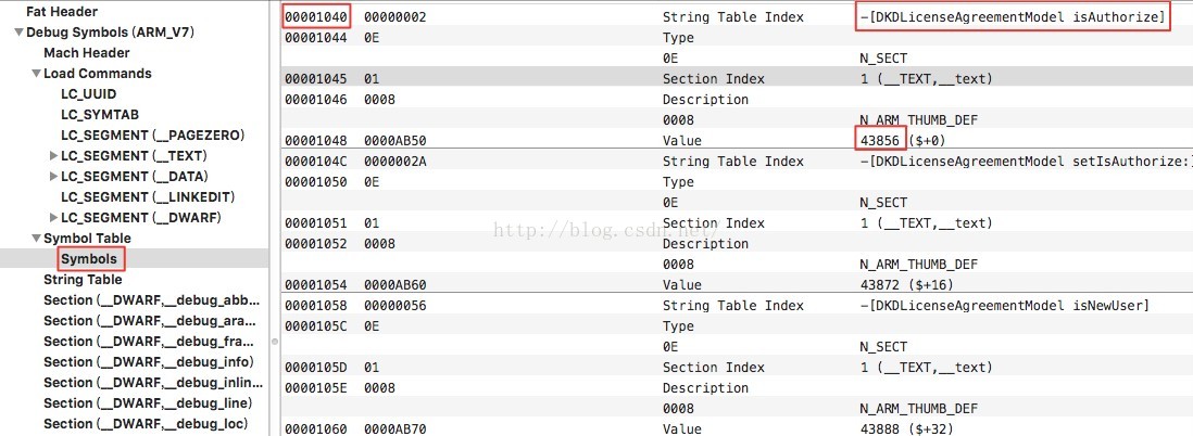 定位地址: 偏移4096+ 64(0x1040),得到函数符号信息模块”Symbols”,把函数符号解析出来,比如第一个函数: “-[DKDLicenseAgreeementModel isAuthorize]”对应的内存地址:模块地址+43856