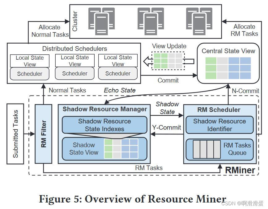 【论文阅读】Not All Resources are Visible:Exploiting Fragmented Shadow Resources in Shared-State Scheduler 本论文增强共享状态调度器架构的可见性,以支持利用集群中的影子资源。论文对不可见的影子资源碎片进行了深入的理论和实验分析,并提出RMiner来敏捷地挖掘影子资源并透明地利用它们。通过工业级模拟,证明 RMiner 可以以较小的开销和冲突来提高服务器集群的整体性能。