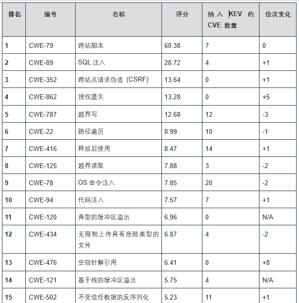 MITRE 表示,“这些弱点易于发现和利用,可发展为可利用的漏洞,导致敌对者完全接管系统、窃取数据或者阻止应用运行。” CISA 提到“该年度榜单发现了用于攻陷系统、窃取数据或破坏服务的最严重的弱点。CISA和MITRE建议组织机构查看该榜单并将其用于完善各自的软件安全策略。”