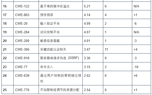 本榜单中最严重和最普遍的弱点是典型的缓冲溢出 (CWE-120)、基于栈的缓冲溢出 (CWE-121)、基于堆的缓冲溢出 (CWE-122)、访问控制不当 (CWE-284)、通过用户控制的密钥绕过授权 (CWE-639)和无限制或门槛的资源配置 (CWE-770)。