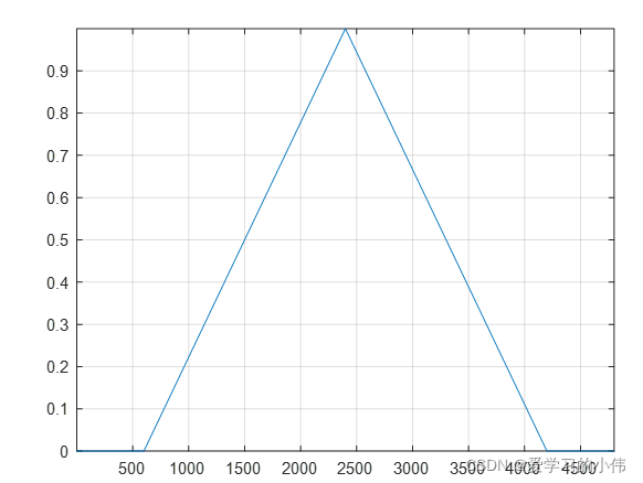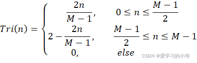 其中n=1,2,⋯,N-1 ,N 表示窗函数的总长度,M表示窗函数的有效长度。三角窗的形状如下图所示。