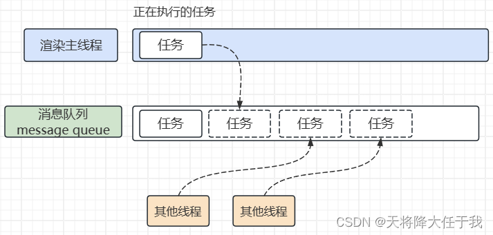 浏览器事件循环 (event loop) JS是一门单线程的语言,因为JS执行在渲染主线程中,为了防止渲染主线程的阻塞,采用异步的方式,碰到耗时任务时交给其他线程处理,自生立即结束当前任务,执行后续任务,而耗时任务的回调函数包装成任务,加到任务队列中末尾,等待调度执行