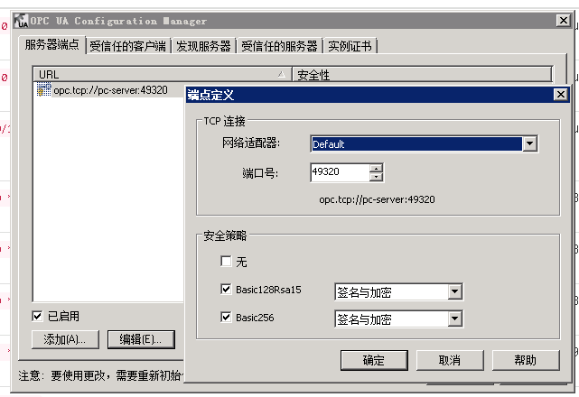 3、KEPWare服务器设置,安装kepware后,在服务器上的kepware系统托盘上点右键,选择OPC UA配置,服务器端点设置如下: