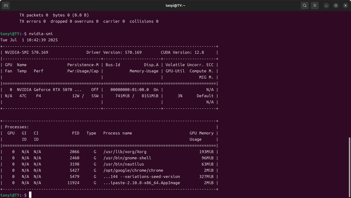 目前50显卡驱动的适配ubuntu很差,基本上安装后就黑屏。我在不断重装了10次ubuntu系统后得到一个能过成功运行nvidia-smi显示出驱动的操作。
