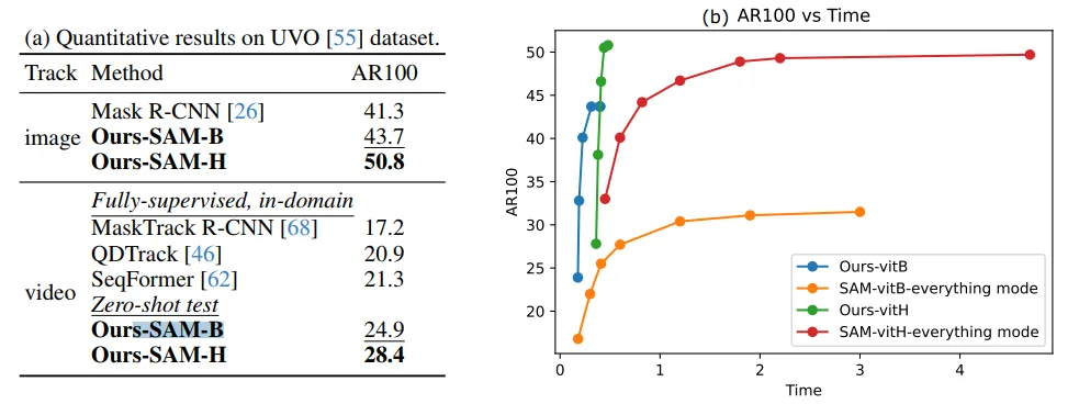 ▲图4|(a) 在UVO数据集上的定量结果;(b) 将推理时间(秒)与原始SAM进行比较,通过采样不同数量的提示点©️【深蓝AI】编译