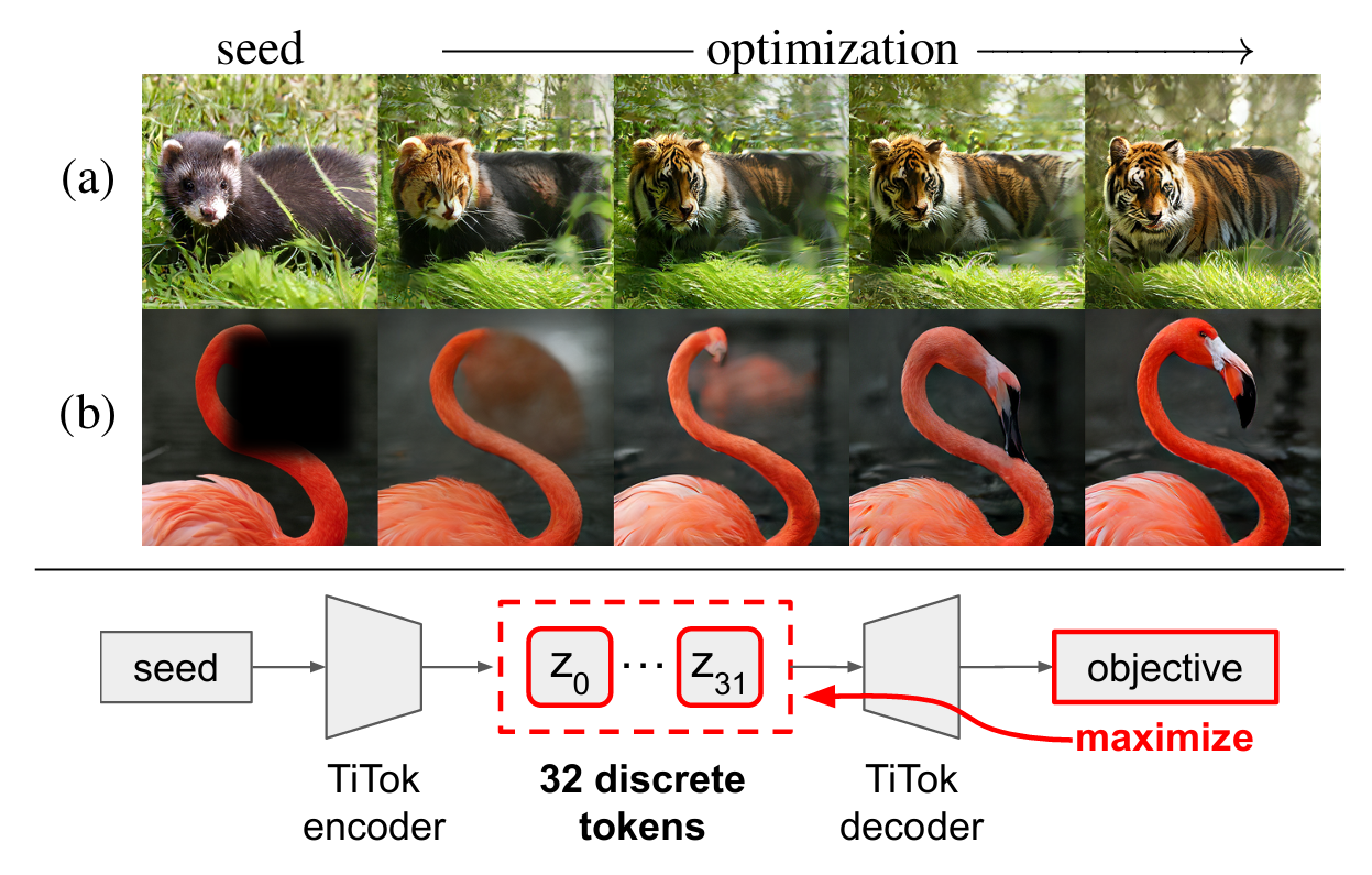 图2|无需额外训练,预训练的一维高压缩 tokenizer 便可直接执行图像生成任务。(a)基于文本的图像编辑;(b)图像修复(inpainting)。得益于其紧凑而富含语义的 latent 空间,系统仅通过在测试阶段对 token 进行梯度优化即可完成生成过程,依托 CLIP 相似度或重建目标实现高质量结果——整个流程无需训练任何生成模型