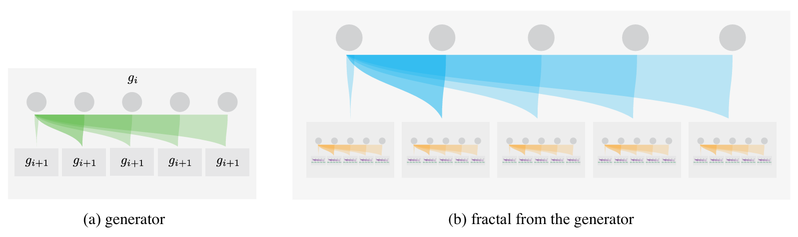 图5|分形生成模型结构示意。 左图展示生成器的层级结构,右图展示模型生成的“分形式”结果。研究者通过在自回归模型中递归调用自回归模块,构建出具有多层自相似特征的生成体系,实现了跨层结构的统一表达。该机制不仅增强了模型的可扩展性,也揭示了生成网络在不同层级间共享结构规律的可能