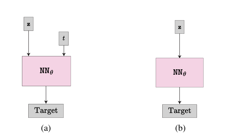 图6|噪声条件在扩散生成模型中的作用对比。 (a) 传统模型通过显式输入噪声引导神经网络进行去噪;(b) 本研究探索在不输入噪声条件的情形下,模型仍可学习隐式的噪声分布表示并保持稳定生成效果。结果显示,去除噪声条件后模型依然具备强大的生成能力,这一发现促使研究者重新思考扩散模型的基本结构假设