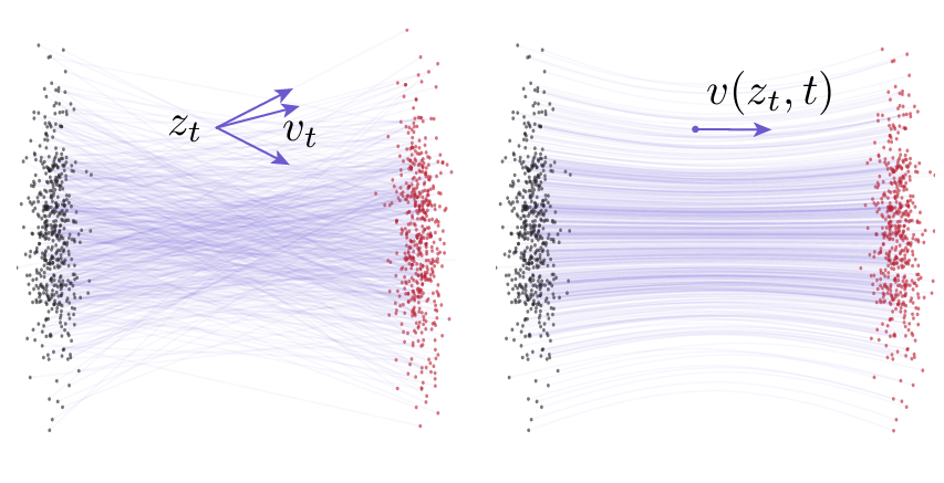 图3|流匹配(Flow Matching)中的速度场示意。左图展示了条件流模型下的瞬时速度分布,不同的噪声样本会产生不同的条件速度;右图则展示了对所有可能条件速度进行边缘化后的平均流场,可视为用于网络训练的“真实流动方向”。这些速度场均描述了数据从先验(灰点)向真实分布(红点)演化的瞬时动态。MeanFlow 在此基础上进一步引入“平均速度”概念,以捕捉整个生成路径的整体趋势,从而摆脱多步采样的束缚,让生成过程在一次前向传播中完成