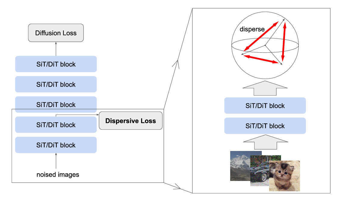 图1|Dispersive Loss 在生成模型中的作用示意。左图展示了在传统扩散模型(如 SiT 或 DiT)中加入 Dispersive Loss 的整体结构;右图放大了前几层的细节。该正则项鼓励中间层特征在隐空间中更加分散,提升生成表示的多样性与稳定性。它直接作用于同一批噪声输入,无需额外参数或外部数据,几乎不增加计算开销,却显著改善了模型的内部表征质量