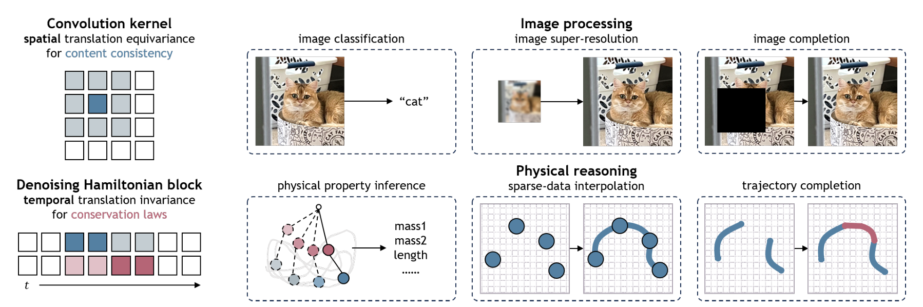 这项研究提出了一个融合物理约束与神经表示的新框架——Denoising Hamiltonian Network(DHN),旨在让深度学习模型具备真实的物理推理能力。传统物理建模方法往往依赖显式的动力学方程或局部时间步模拟,而 DHN 将哈密顿力学(Hamiltonian mechanics)算子推广为可学习的神经算子,能够同时捕捉长时依赖与高层物理交互。该框架引入“去噪机制”以抵消数值积分误差,并通过全局条件化策略支持多物理系统的联合建模。与以往仅关注仿真精度的模型不同,DHN 可在预测、逆推、跨系统迁移等多类物理推理任务中统一工作,兼顾理论可解释性与神经网络的灵活表达力,展示了神经算子在物理世界建模中的巨大潜力。