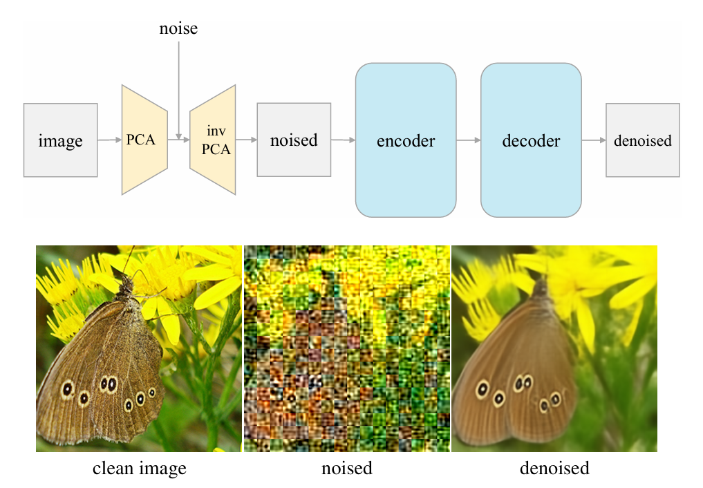 图8|从扩散模型回归“本源”的潜空间去噪自编码器(l-DAE)结构。 经过对扩散模型的系统性解构,研究者最终得到这一极为简化的框架:输入图像首先通过基于 patch 的 PCA 投影到潜空间中,并在该空间内添加噪声;随后经反向 PCA 投影回像素域,由自编码器学习重建出无噪声图像。这样的结构几乎回到了最经典的 DAE 形式,只是噪声被转移到了潜空间层面。尽管设计极简,模型依然展现出与现代扩散架构相当的自监督表征能力,凸显了“简单结构也能孕育强大特征”的思想