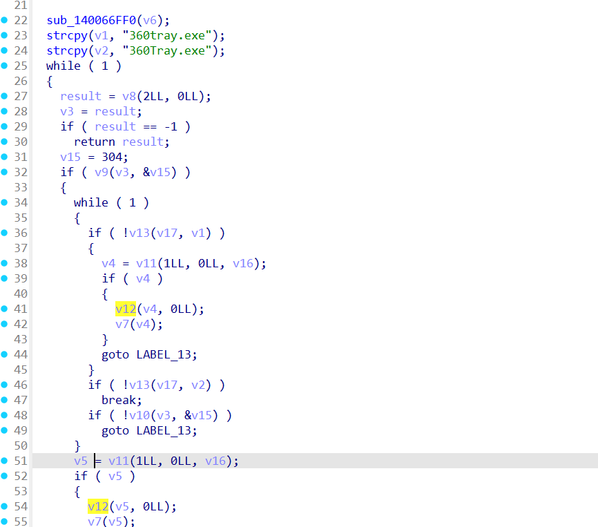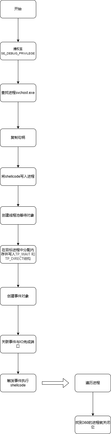 注入的shellcode大致如下,简单一个遍历进程并关闭360