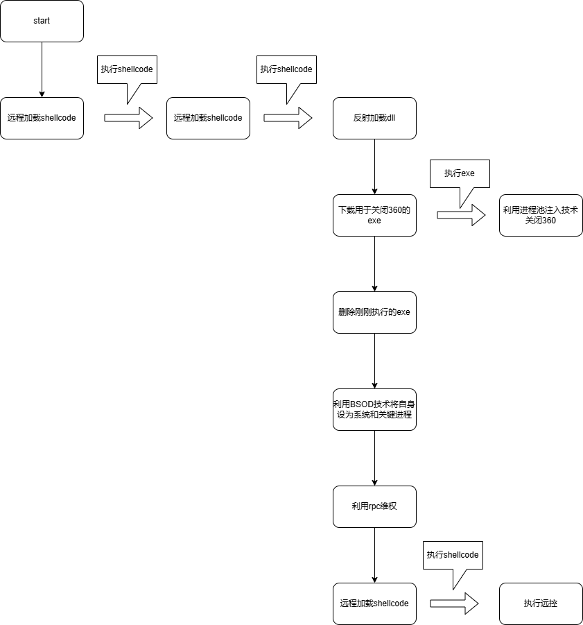 程序执行流程如下,通过多次远程加载shellcode执行远控