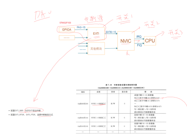 | Bit0~Bit31 | 32个门禁卡开关:每个开关对应一个GPIO引脚(如Bit0对应PA0,Bit1对应PA1)。 | - 0:屏蔽该引脚的中断(保安忽略这个门禁卡的警报)。 - 1:允许该引脚的中断(保安立即上报警报)。 |