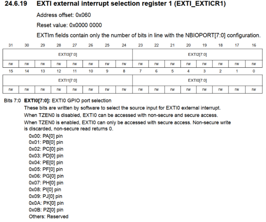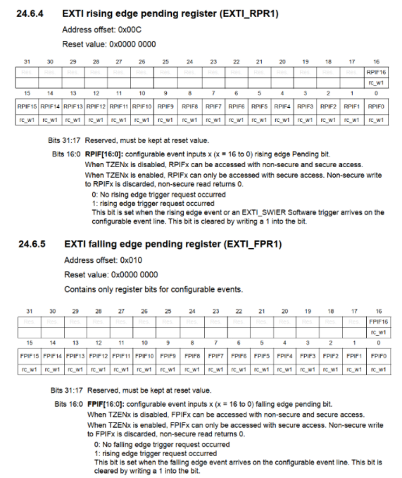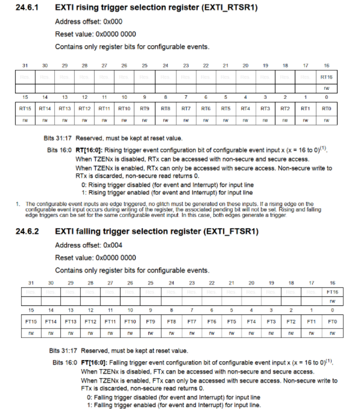 - 除了配置GPIOx_ICR1,还需通过其他寄存器(如EXTI_IMR)允许该引脚的中断,否则规则无效。