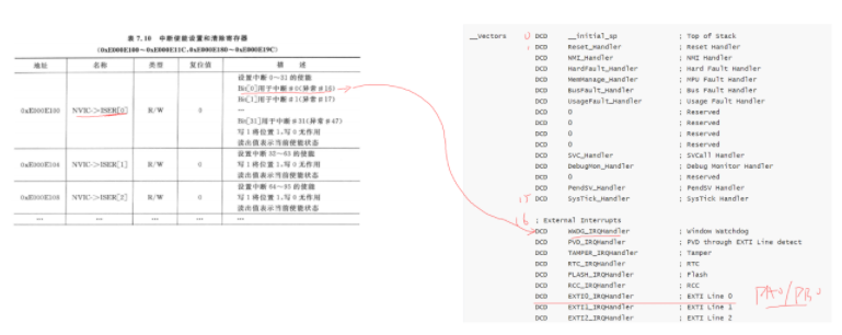 M3/M4的向量表中,放置的是具体异常/中断的处理函数的地址。 比如发生Reset异常时,CPU就会从向量表里找到第1项,得到Reset_Handler函数的地址,跳转去执行。 比如发生EXTI Line 0中断时,CPU就会从向量表里找到第22项,得到EXTI0_IRQHandler函数的地址,跳转去执行。