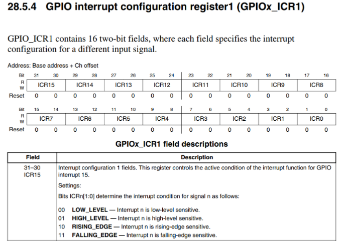 每组GPIO中都有对应的GPIOx_ICR1、GPIOx_ICR2寄存器(interrupt configuration register )。 每个引脚都可以配置为中断引脚,并配置它的触发方式: