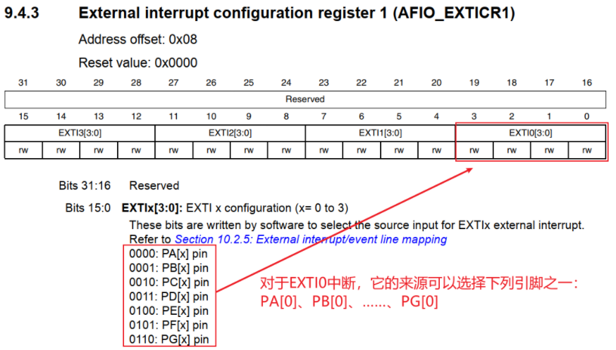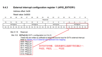 | 复位值全0 | 默认状态:所有引脚的中断被屏蔽(保安不响应任何门禁警报)。 | 必须手动开启需要的中断(比如允许PA0按键触发)。 |