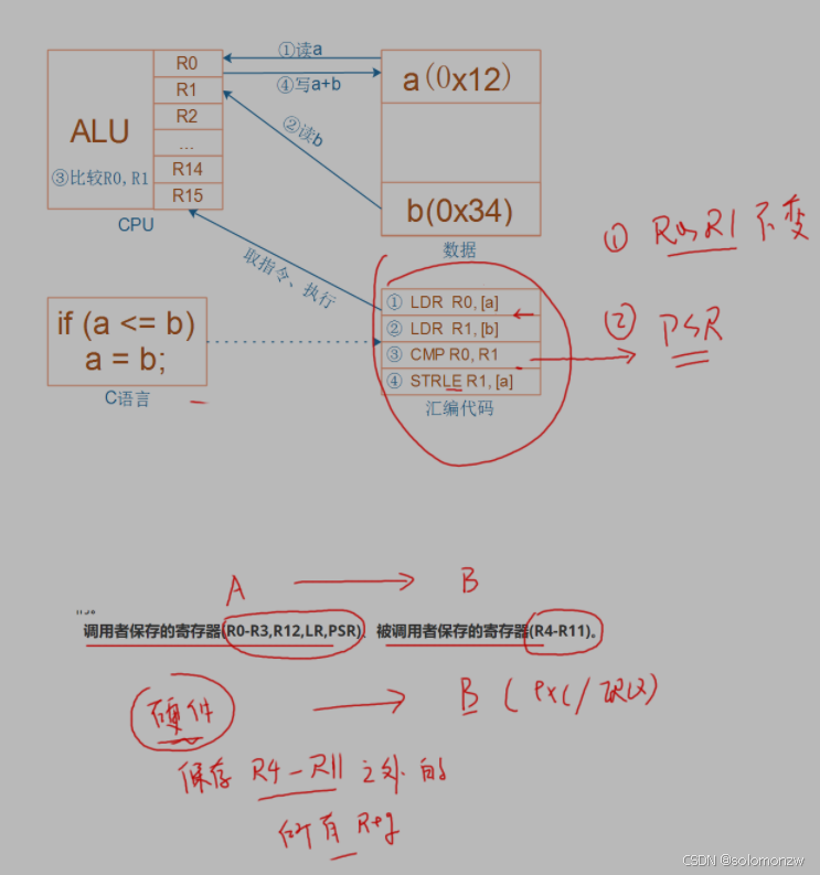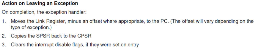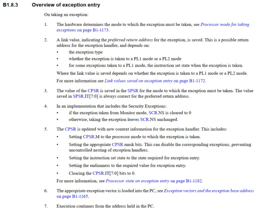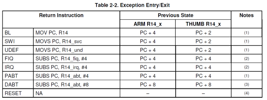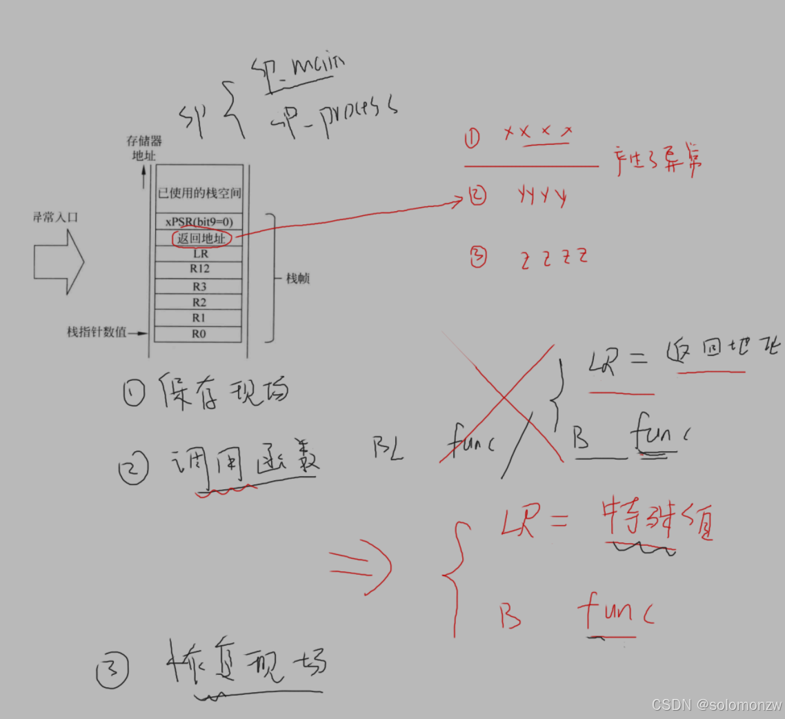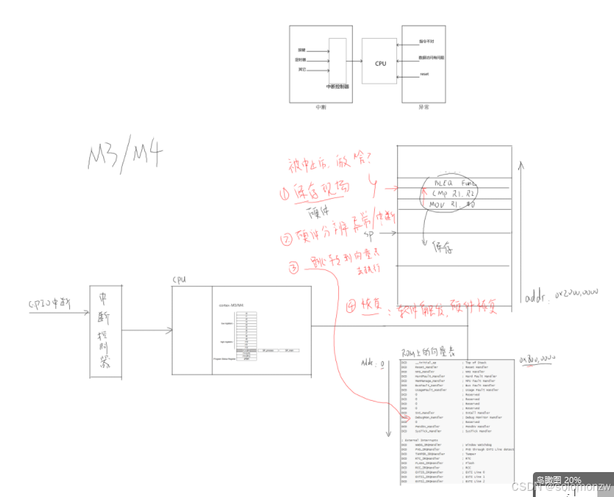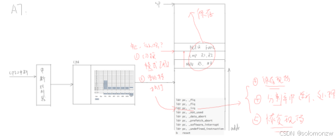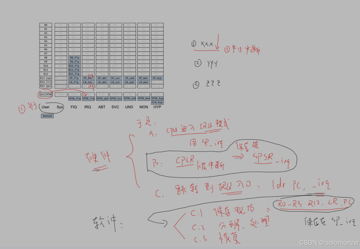 ARM系统中如何处理异常与中断?重点在于保存现场以及恢复现场, 处理过程如下: