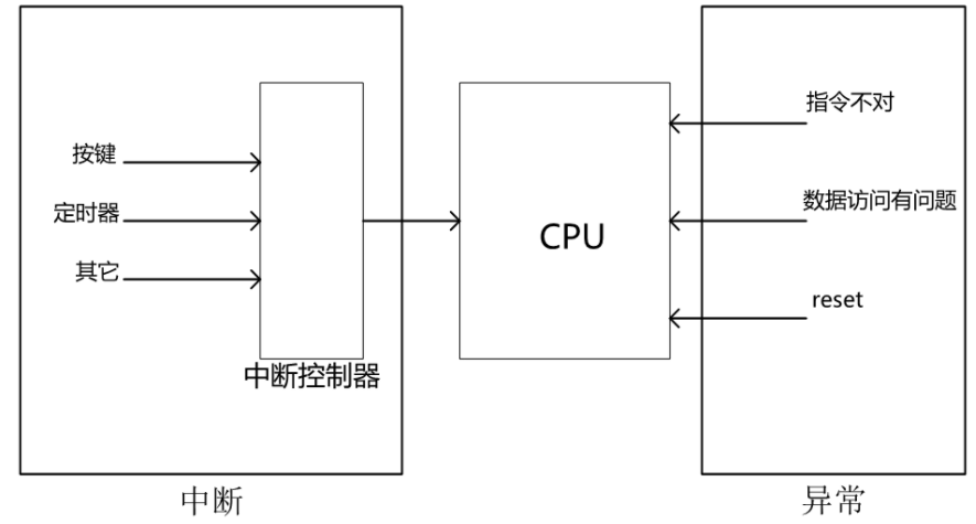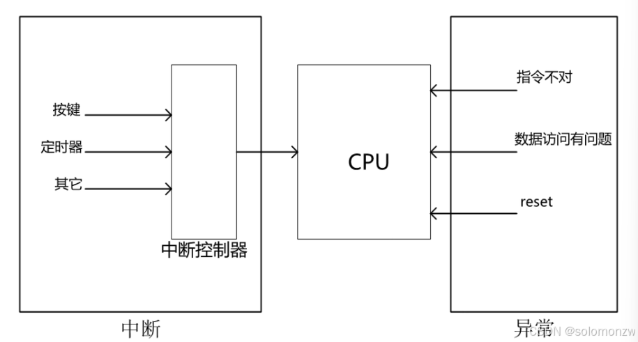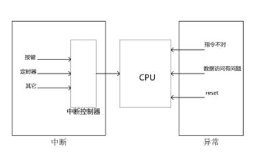 产生中断,举例:按下按键--->中断控制器--->CPU