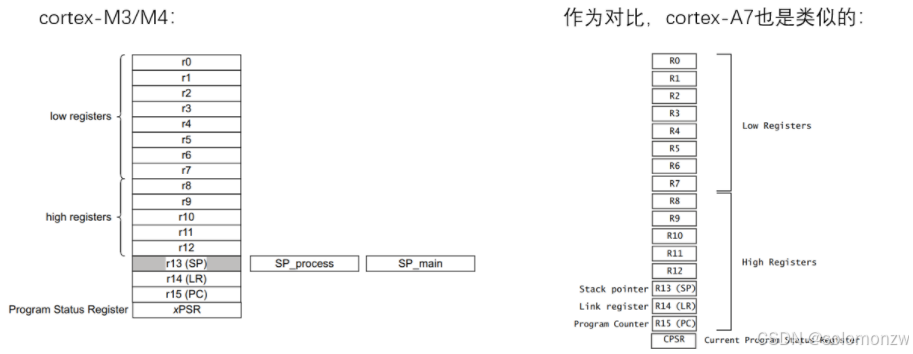保存/恢复现场:cortex M3/M4是硬件实现的,cortex A7是软件实现的