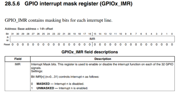 - IMR的32个Bit位:每个开关(Bit位)对应一个引脚,控制是否允许这个引脚的中断触发。