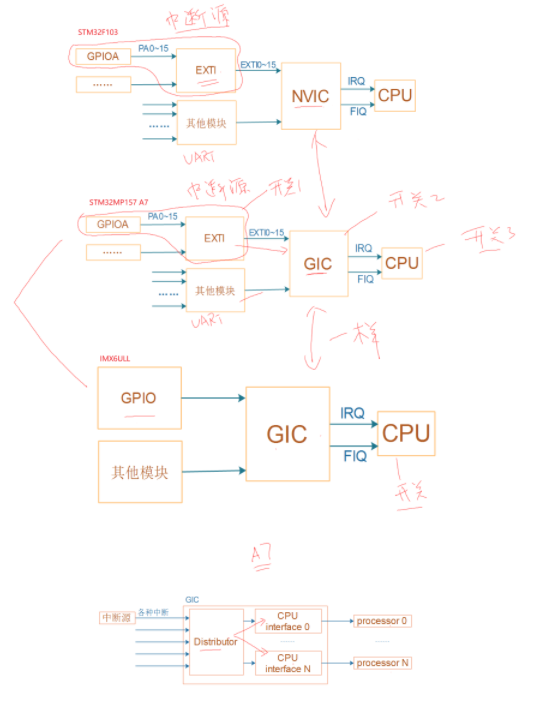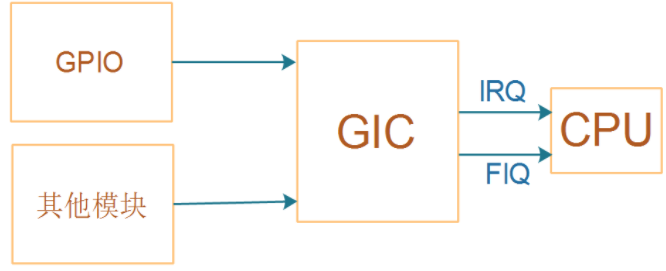 所有的中断源(按键、定时器等),它们发出的中断汇聚到中断控制器, 再由中断控制器发信号给CPU,告诉它发生了那些紧急情况。