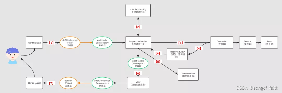- 前端控制器 DispatcherServlet:接收请求、响应结果,相当于转发器,有了DispatcherServlet 就减少了其它组件之间的耦合度