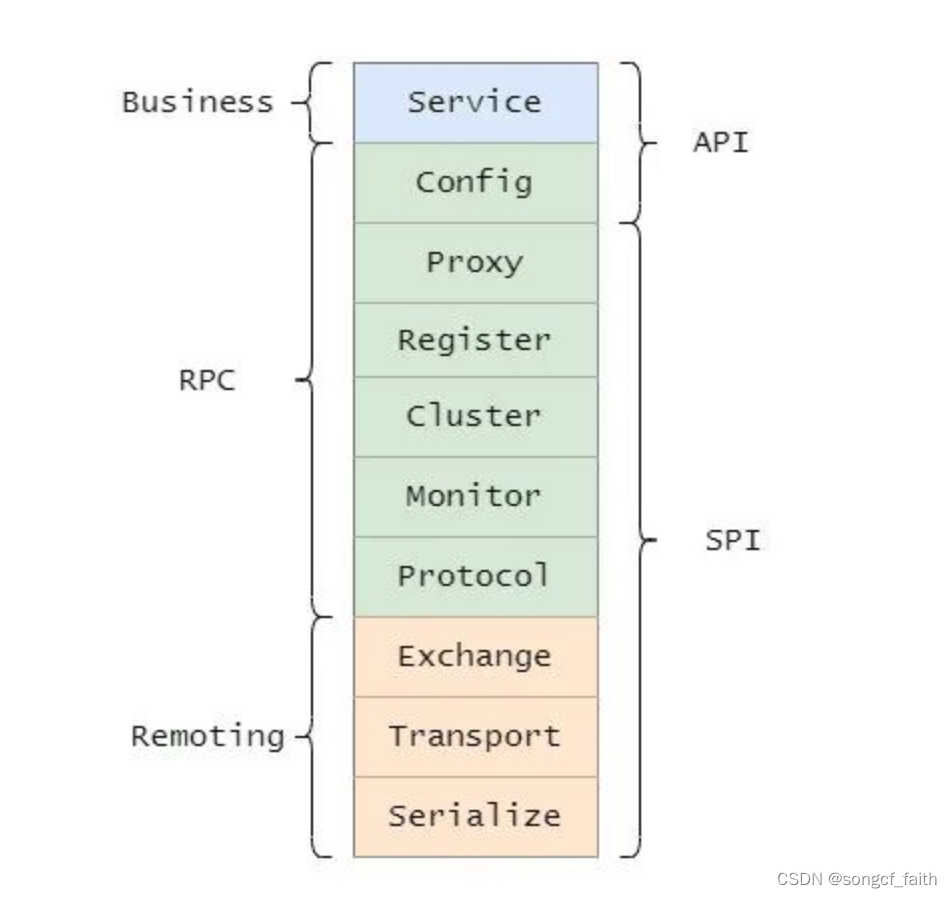 实现上分为 API 层和 SPI 层,分 API 层和 SPI 层这是 Dubbo 成功的一点,采用微内核设计+SPI扩展,使得有特殊需求的接入方可以自定义扩展,做定制的二次开发。
