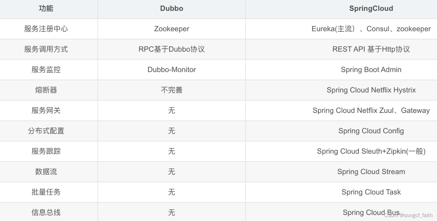 - 组件差异比较多:例如SpringCloud注册中心一般用Eureka,而Dubbo用的是Zookeeper