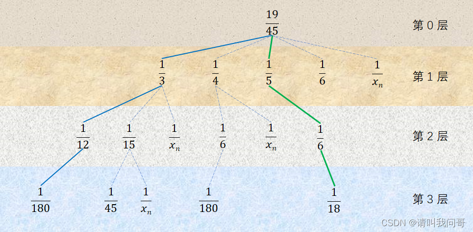 举个例子(图中的蓝色实线代表首先通过贪心算法找到的解,虚线代表可能的搜索路径,绿色的实现代表最优解),为了求出19/45的埃及数表现形式,我们首先使用贪心算法得到一个解,先减去1/3,再用余数减去1/12(所能减去的最大的分数),一直到得到1/180,满足条件,就停止往下搜索。这就是我们通过贪心算法得到的第一个解。而这个解包含有三个加数,1/3、1/12和1/180,所以我们可以说这个解的深度是3(从上到下第三层就得到解),所以当我们从第三层返回到第二层,试着用下一个加数(1/15)进行计算的时候,我们只要再向下试一个数,如果找不到就返回,而不需要再去第四层、第五层甚至更深去搜索了。同样的道理,如果从第二层返回第一层的时候,在第一层分别去试1/4和1/5,如果能在第二层得到解,则马上把深度更新为2,后面的计算都不用再向第三层计算了。