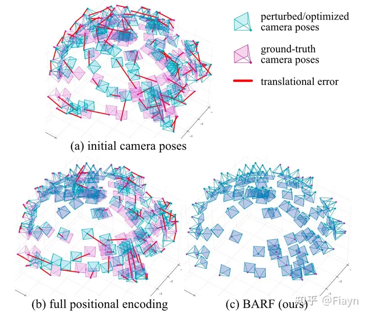 nerf等重建方法对相机位姿要求严苛,最简单的想法是通过back-propagation对相机位姿也同时优化,但是在实践中发现这对初始化很敏感,而且容易收敛到次优解,降低重建质量。注意,positional encoding益于重建,但同时导致次优解。