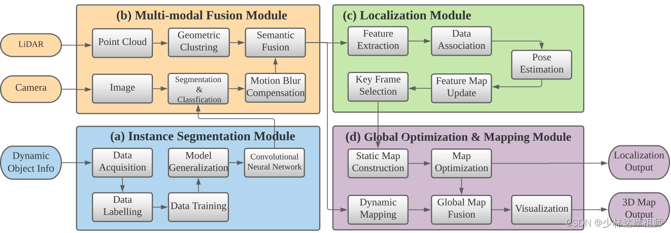本文探讨了实时动态SLAM技术,如RDS-SLAM和YOLOv5+SLAM,以及视觉、雷达和IMU的紧密耦合状态估计与地图构建。重点介绍了深度融合的多对象跟踪框架、雷达点云的语义分割方法和多模态语义SLAM在动态环境中的应用。