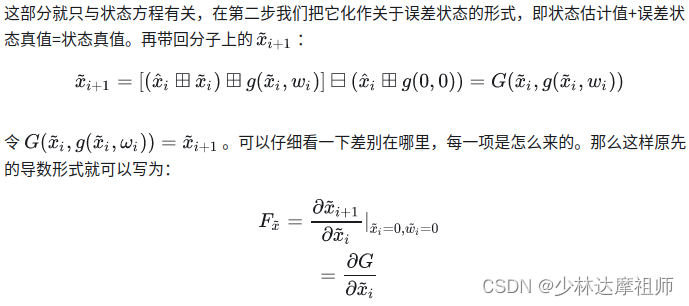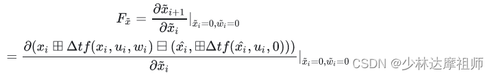 KF用的是一阶泰勒展开,那么这里的F_x就是一阶导,又因为误差和噪声的期望都为0,所以这使得我们可以在0处展开,因此只需要求解在0处的导数即可:
