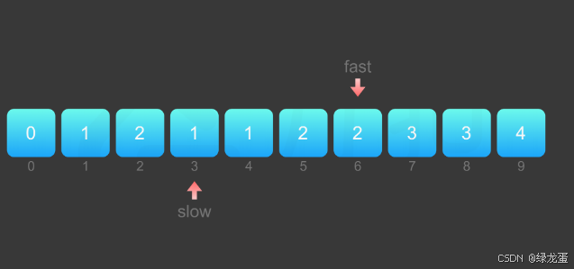 定义两个指针fast和slow,分别为快指针和慢指针,快指针表示遍历数组到达的下标位置,慢指针表示下一个不同元素要填入的下标位置,对于每个位置,如果 nums[fast]
