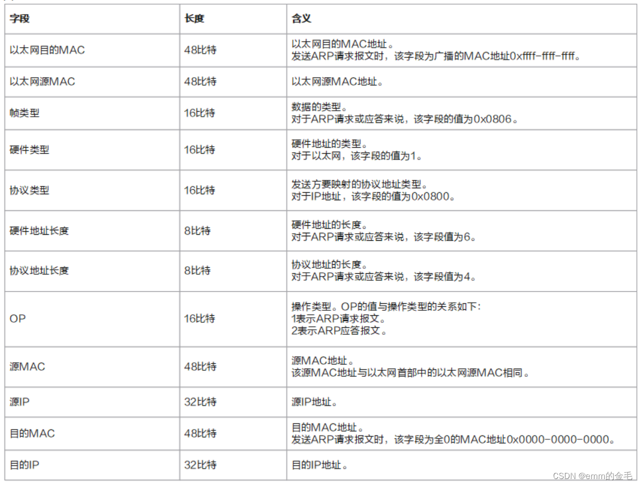 报文的长度是42字节。前14字节的内容表示以太网首部,后28字节的内容表示ARP请求或应答报文的内容。报文中相关字段的解释如下图所示。