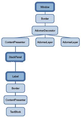 视觉树基本上是逻辑树的一种扩展。逻辑树的每个结点都被分解为它们的核心视觉组件。逻辑树的结点对我们来说是不可见的。而视觉树不同,它暴露了视觉的实现细节。下面是Visual Tree结构就表示了上面四行XAML代码的视觉树结构(下面这幅图片来源于WPF揭秘):