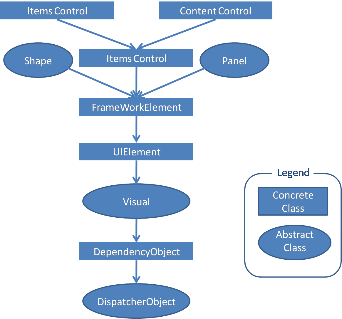 在WPF中常用的的控件类继承结构如下图所示(图中圆圈的表示抽象类,方框的表示实体类):