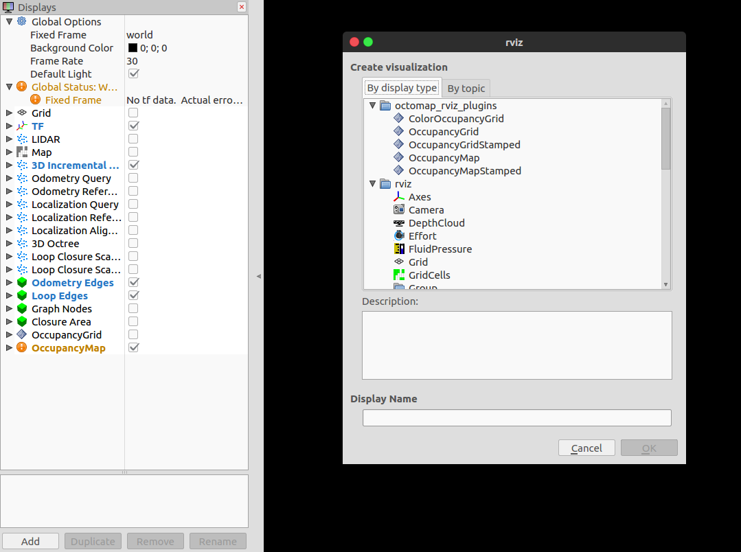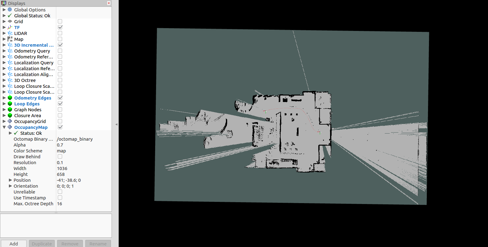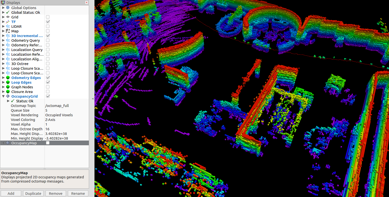 其中的OccupancyGrid是显示三维概率地图,也就是octomap地图。OccupancyMap是显示二维占据栅格地图。