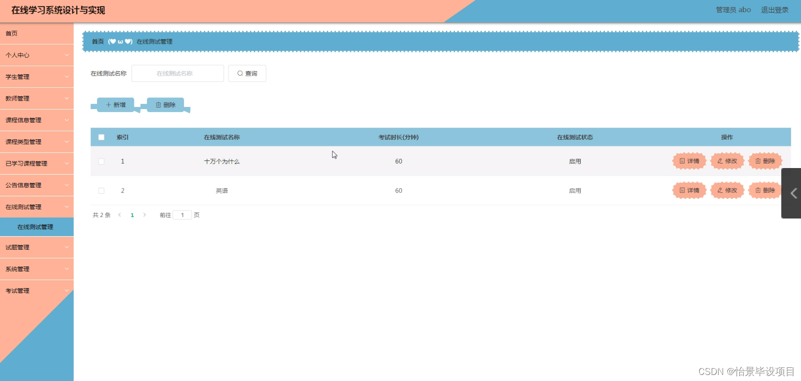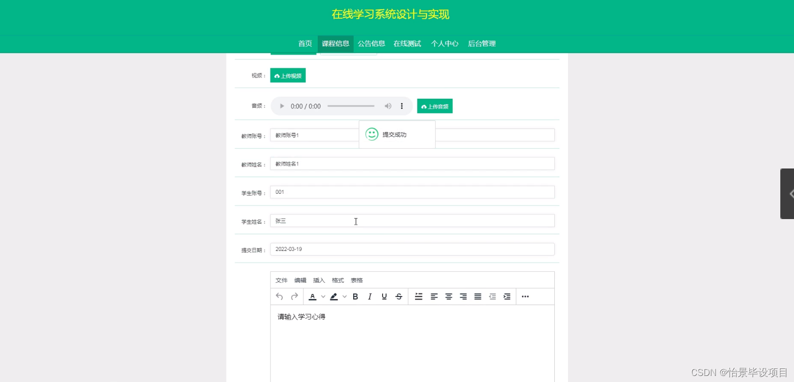 本文探讨了在互联网技术背景下,如何设计并实现一个高效的在线学习系统,涉及数据库MySQL5.7、开发工具如Eclipse和IntelliJIDEA,以及前端技术(HTML、CSS、JavaScript、Vue.js)和后端技术(Java、Spring、MyBatis)。详细描述了系统部署环境、开发流程和数据库交互,强调了前端与后端的协作方式。